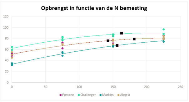 Daarnaast blijkt de opbrengst van de vier rassen snel toe te nemen in functie van de stikstofbemesting, tot het stikstofbemestingsadvies (zwarte vierkantjes op de grafiek) wordt bereikt. Van dan af is de toename in opbrengst eerder klein in vergelijking met de extra hoeveelheid stikstof die toegediend wordt.