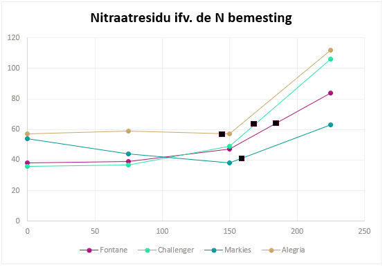Bij de rassen Alegria, Challenger en Fontane was de stijging in het nitraatresidu zo groot dat de eerste drempelwaarde van 85 kg N/ha overschreden werd. Het ras Markies bleef overal onder de eerste drempelwaarde.