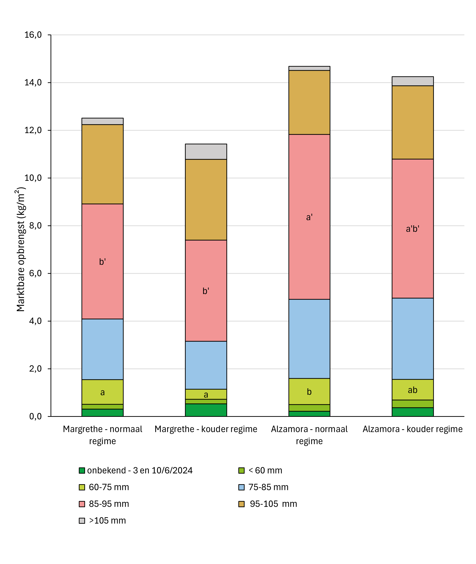 Figuur: Marktbare opbrengst per ras en regime. Voor de diameterklasse 60-75 mm en 85-95 mm duiden de verschillende letters significante verschillen aan. In de andere klassen waren er geen significante verschillen. Er werd geoogst van 6 mei tot 9 november 2024. Op 3 en 10 juni 2024 werd de diameter van de vruchten niet bepaald.
