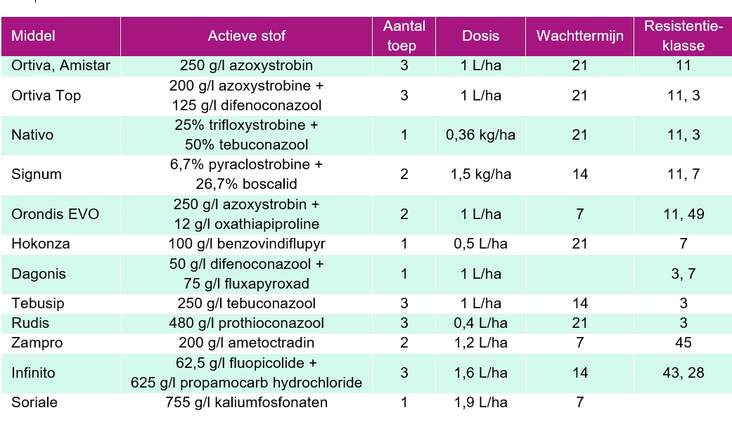 Tabel: Vele beschikbare fungiciden werken goed preventief. |