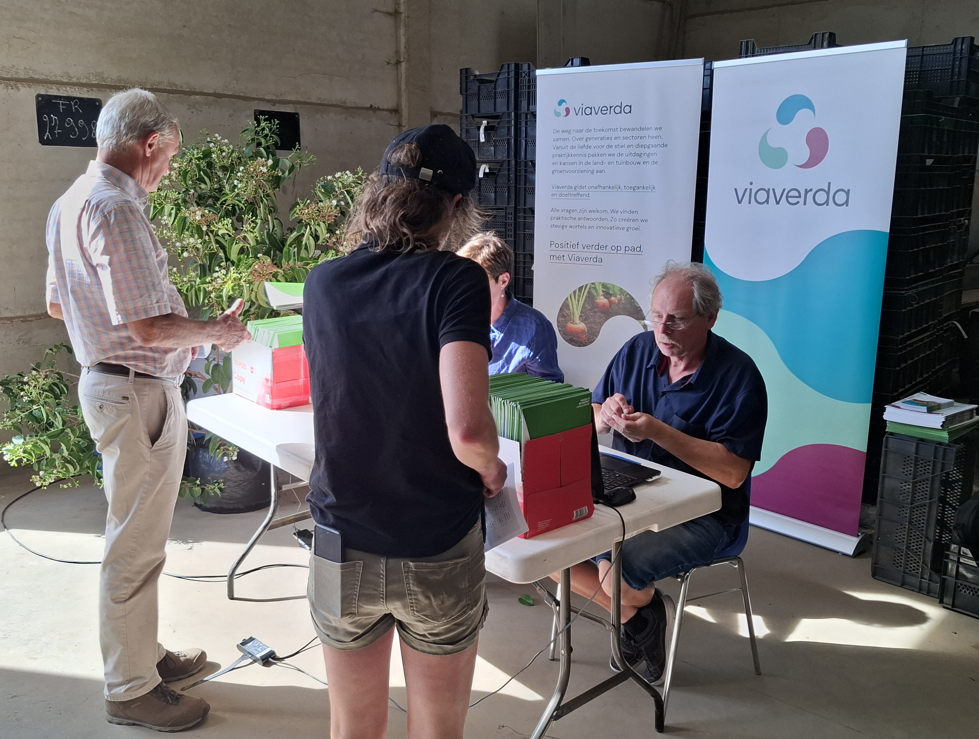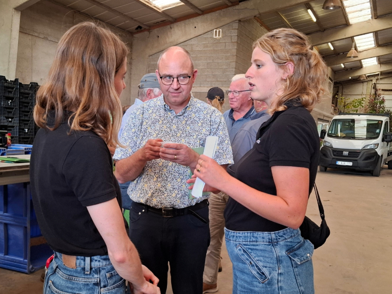 Pascal Braekman (Agentschap Landbouw en Zeevisserij) in overleg met Emma Lanoo (Viaverda) en Isolde De Beule (Viaverda). |