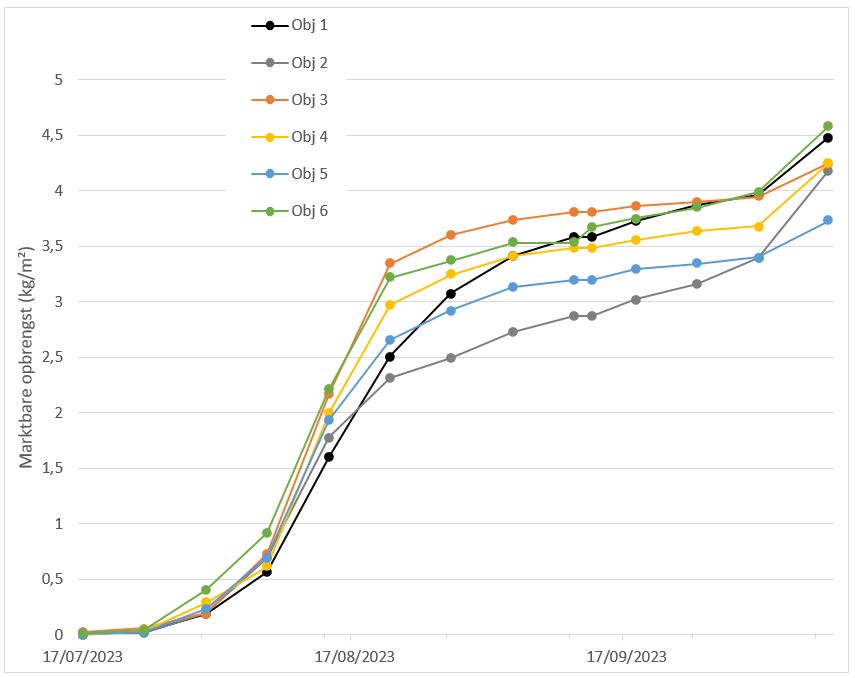 Doorheen de proef werd de marktbare en niet-marktbare opbrengst bijgehouden. Figuur 2 geeft de marktbare opbrengst weer. De objecten die een bemesting OPF kregen net na het planten (objecten 3 en 6) leken vroeg in het seizoen het productiefst. Aan het einde van de teelt (12 oktober) leek object 6 (strategie met extra bijbemesting) de grootste marktbare opbrengst te realiseren, gevolgd door object 1 (bokashi). De opbrengstverschillen tussen de verschillende bemestingsstrategieën bleken echter niet significant.