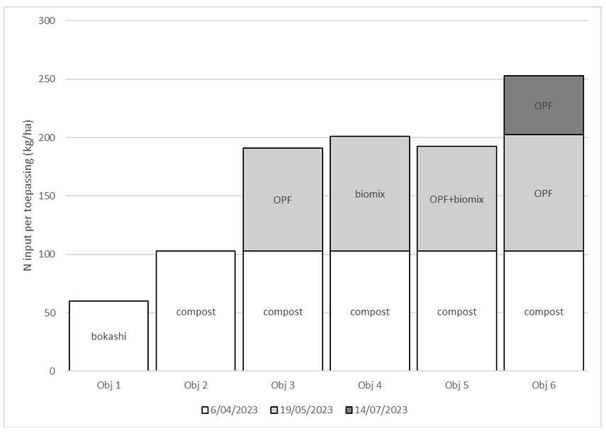 Figuur 1 geeft een overzicht van de zes vergeleken bemestingsstrategieën. Er werd algemeen een maand voor het planten bemest met 500 kg/ha Vivikali en 19,3 ton/ha compost, uitgezonderd voor object 1 waar bokashi-strooisel (19,3 ton/ha) werd toegediend (op 6 april). Net voor het planten ontstond echter een technisch probleem met de beregening. Over alle plots heen werd overmatig beregend. Een bodemstaal gaf aan dat bijna alle minerale stikstof was weggespoeld uit de bovenste bodemlaag (0-30 cm).