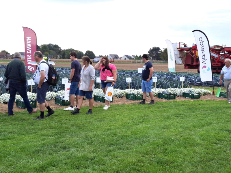 Luc De Reycke, gewezen bedrijfsleider van Viaverda in Kruisem, inspecteert met onderzoeker Annelien Tack de verschillende preirassen. Recente preirassen beoordelen: dat lokte veel bezoekers naar het groenteplatform. De belangrijkste zaadhuizen waren op de afspraak. Recente preirassen van verschillende groentezaadhuizen werden op het demoplatform aangeplant. Een deel ervan werd vorig weekend ook gerooid.