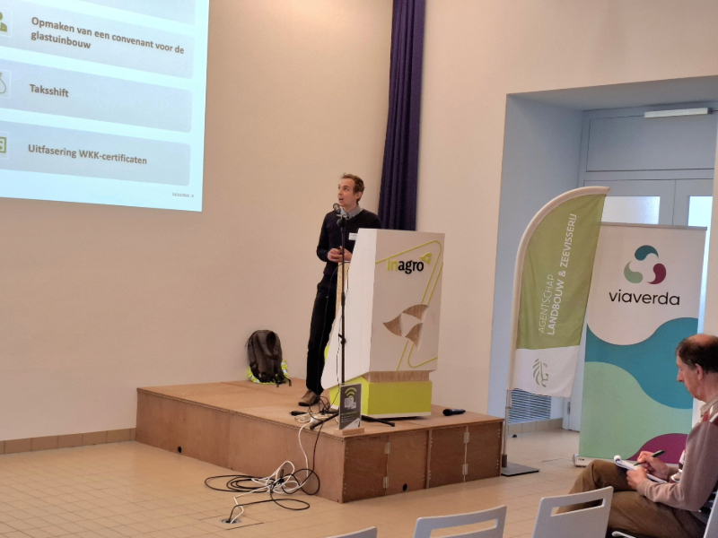 Het evenement, dat liep van 13 tot 17 uur, stond volledig in het teken van rendabele energietechnieken en duurzame oplossingen die vandaag al worden toegepast of volop worden onderzocht in de moderne land- en tuinbouw. De studiedag werd georganiseerd door het Agentschap Landbouw en Zeevisserij. De presentaties werden verzorgd door de verschillende partners, onder meer Viaverda.