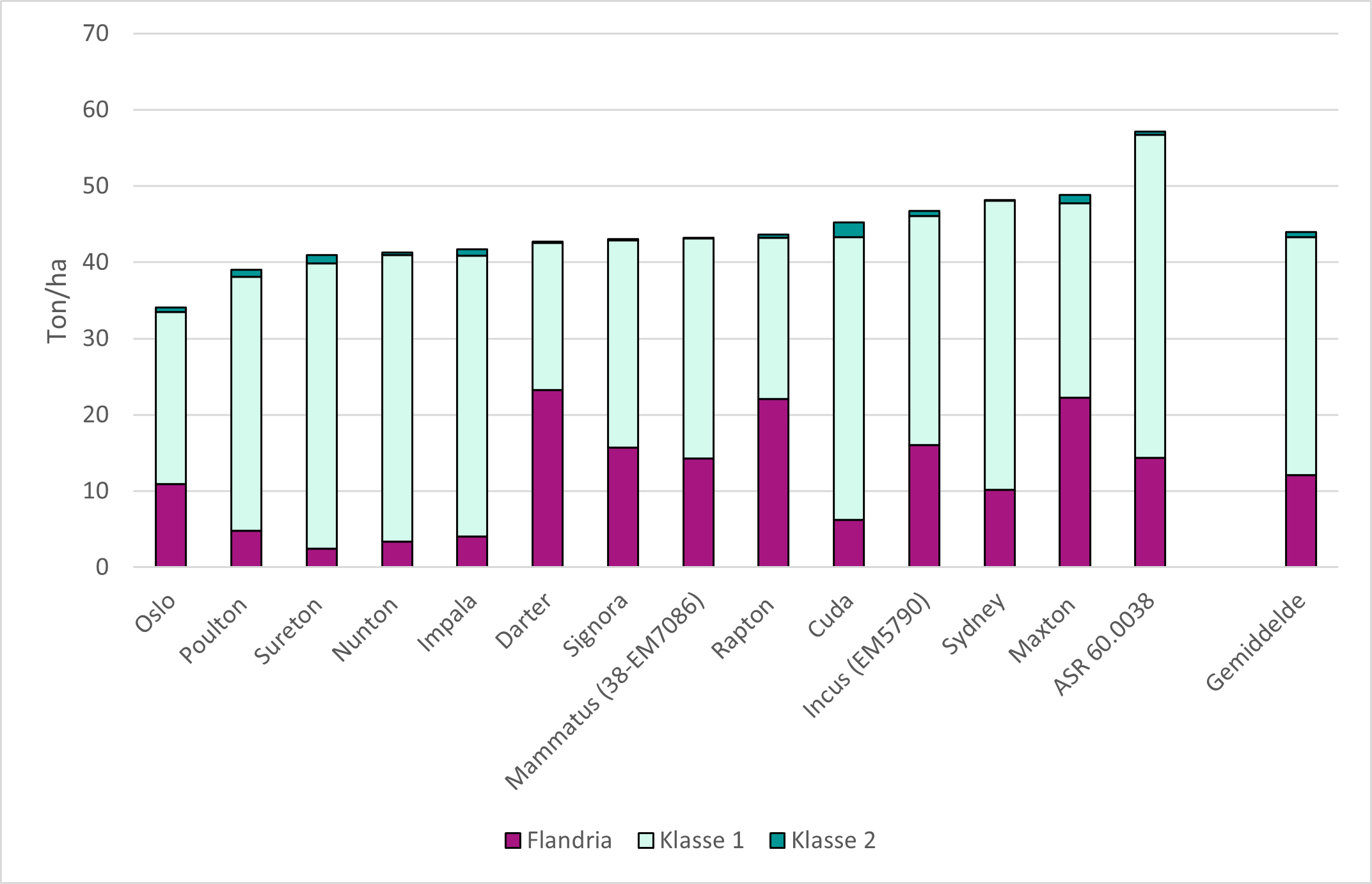 Het nummer ASR 60.0038 van StormSeeds haalde met 57,2 ton/ha veruit de hoogste opbrengst in deze proef. Het aandeel Flandria bleef echter beperkt tot 17% van de totale opbrengst. Maxton (Nunhems) combineerde net als in de zomerperiode een mooie opbrengst van 48,8 ton/ha met een hoog percentage Flandria kwaliteit (46%) omwille van zijn sterkte tegen trips. Zijn schotgevoeligheid kwam ook in deze proef naar boven. Ook Darter (Bejo) en Rapton (Nunhems) toonden zich erg sterk tegen trips en behaalden in de proef het hoogste aandeel Flandria (respectievelijk 55 en 51%).