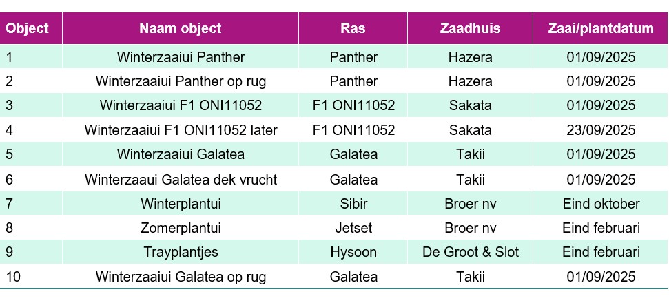 De ruggen voor object 2 en 10 werden vooraf, op 25 augustus 2025 getrokken. Op 1 september 2025 werden de eerste winteruien gezaaid in goede omstandigheden. De latere zaai volgde op 23 september 2025. Dit jaar werd voor elk object winterzaaiuien aan 5E/ha gezaaid in 4 rijen op bedjes van 1,5m, om de uniformiteit tussen de objecten te garanderen. Voor het einde van de maand planten we nog de winterplantuien. In het voorjaar gaan ook voorjaarsplantuien en trayplantjes de grond in.