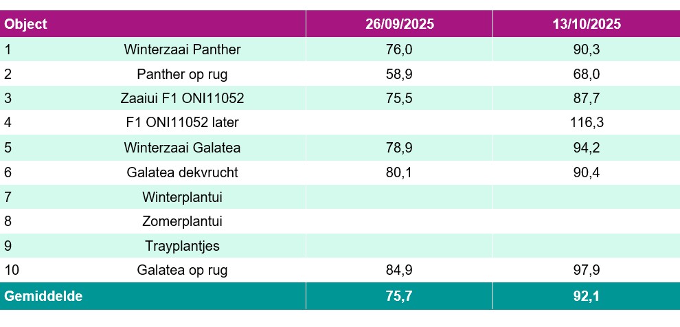 Intussen werden al twee opkomsttellingen uitgevoerd in de winterzaaiui. Op 26 september 2025 stond in de meeste objecten >75% boven. Op 13 oktober 2025 is dit percentage in de meerderheid van de plots gestegen tot boven de 90%. Enkel voor Panther op ruggen is de opkomst duidelijk lager. Het hoogste opkomstpercentage daarentegen, zien we, los van object 4, voor Galatea op ruggen (97,9%). We vermoeden dat object 4, het later gezaaide object, dikker gezaaid werd dan voorzien. Waarschijnlijk als gevolg van foutieve afstelling van de gebruikte handzaaimachine, met een onrealistisch hoog opkomstpercentage als resultaat.