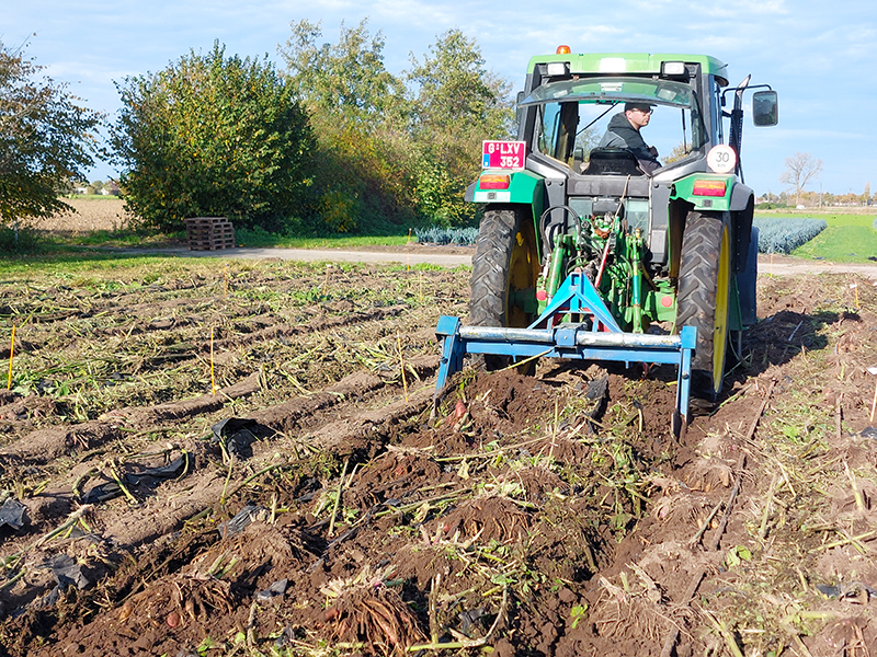 Yacon is sterk vorstgevoelig en wordt daarom best vóór de eerste vorst geoogst. Bij vorst verkleurt het loof onmiddellijk zwart en kunnen de knollen vorstschade oplopen, wat absoluut vermeden moet worden. We oogstten yacon begin november. Bij Viaverda wordt het loof eerst verwijderd met een loofklapper met schijven (Baselier) en zijafvoer. Deze zijn goed voor het klapwerk. Extra schijven versnijden het loof bijkomend.