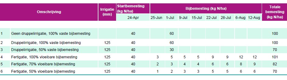 Bij het niet-geïrrigeerde en twee geïrrigeerde objecten (objecten 1, 2 en 3) werd KAS bijgestrooid. De drie andere objecten werden gefertigeerd (objecten 4, 5 en 6). De startbemesting was voor alle objecten hetzelfde maar de bijbemestingsdosis werd telkens getest aan 100% en 50%. Bij fertigatie werd bovendien nog een extra object aangelegd waarbij slechts 70% van het bijbemestingsadvies werd uitgevoerd.