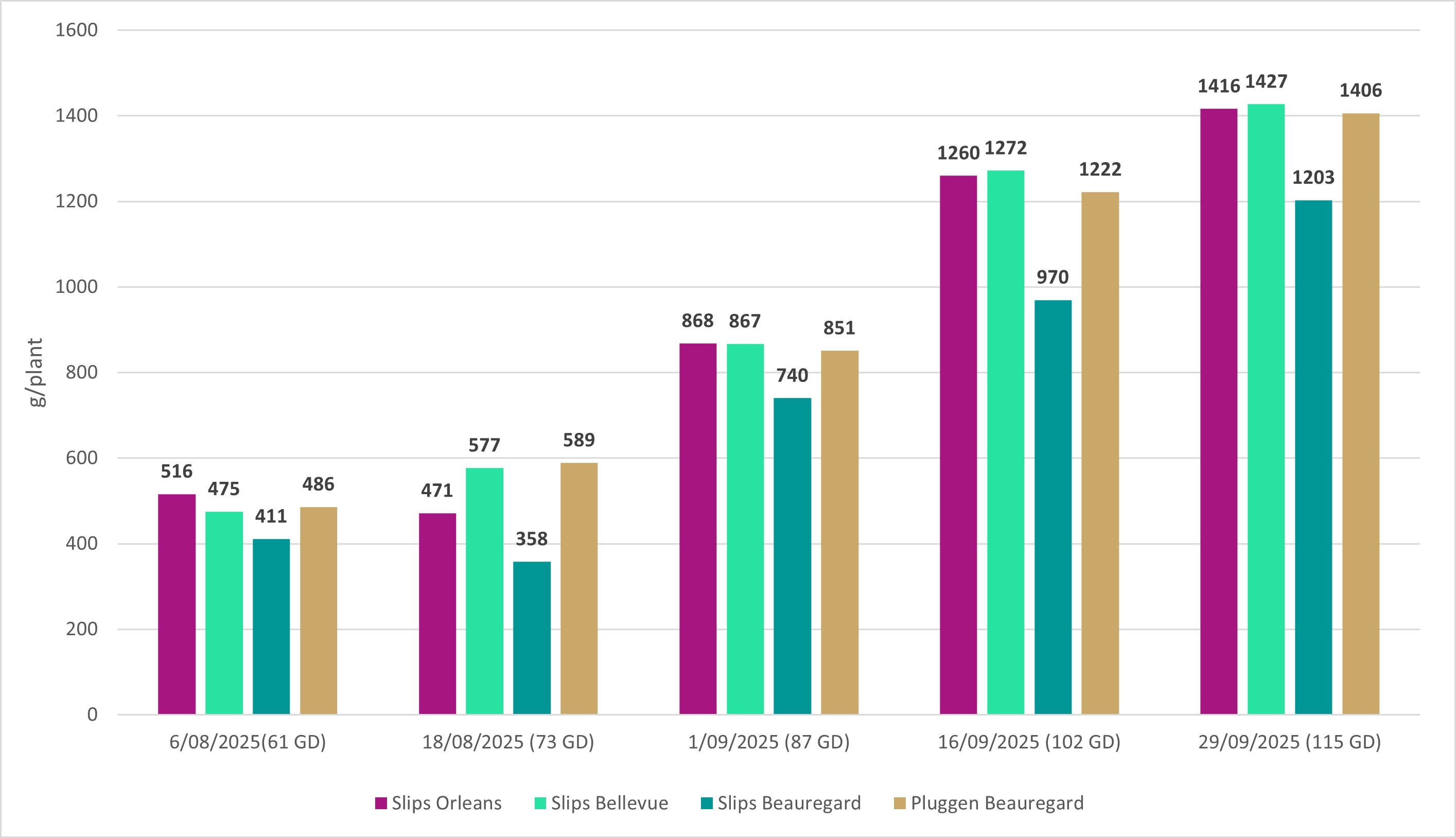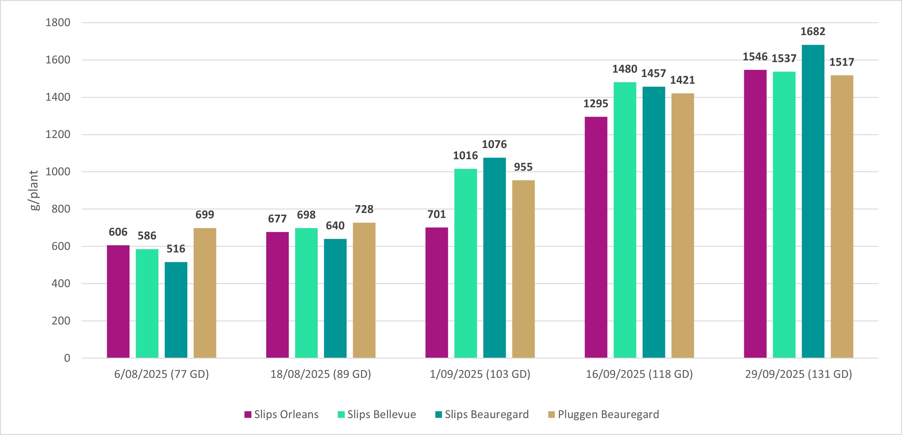 Voor het vroegste planttijdstip zitten alle rassen bij oogst op 29 september 2025 boven de 1500 gram per plant. Dergelijke gewichten werden in 2024 nergens gehaald. De slips van Beauregard lijken in de tweede helft van september nog een extra groeispurt te hebben gerealiseerd. Daar werd een gemiddelde opbrengst van 1682 gram per plant genoteerd op 29 september 2025.