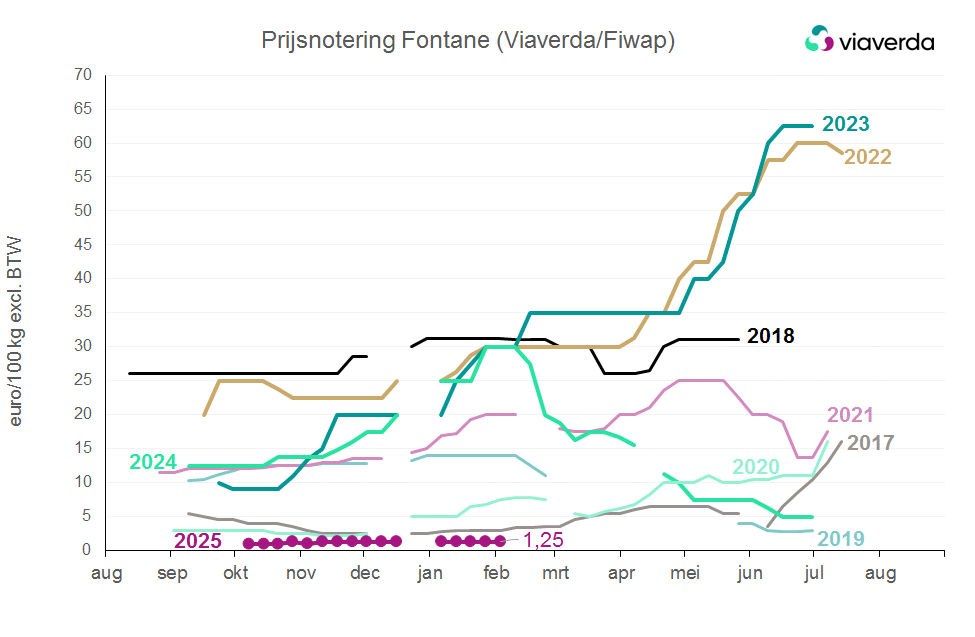 De prijs voor Fontane en Challenger bedraagt i.f.v. afnemer 1 tot 1,5 euro per 100 kg. De marktstemming is flauw. Het aanbod blijft aanwezig. Enkele verwerkers zijn actief op de markt. Ze kopen weinig bij of beperken zich tot het afnemen van +50mm aan iets hogere prijs. De export loopt redelijk, maar wordt bemoeilijkt door transportproblemen en concurrentie. Er een toenemende aankoopinteresse van meerdere landen.