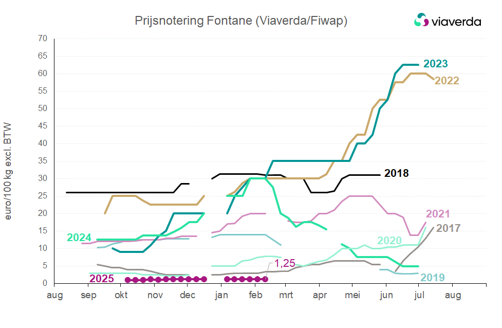 De prijs voor Fontane en Challenger bedraagt i.f.v. afnemer 1 tot 1,5 euro per 100 kg. De marktstemming is flauw. Het aanbod blijft aanwezig. Er zijn weinig aankopers actief op de markt. De export loopt verder, maar wordt steeds moeilijker door transportproblemen, concurrentie en zeer lage prijzen.