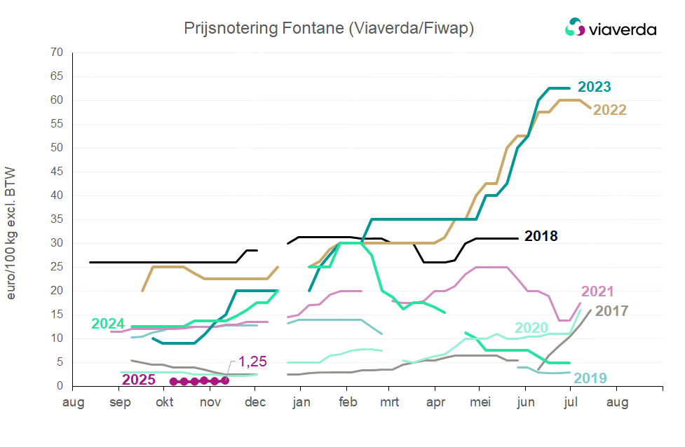 De prijs voor Fontane en Challenger bedraagt i.f.v. afnemer 1 tot 1,5 euro per 100 kg. De marktstemming is flauw. Er zijn weinig transacties op de vrije markt. De verhandelde volumes beperken zich tot overtonnen, voor zover verwerkers hier interesse in hebben. Er blijft een beperkte vraag voor export met soms betere prijzen i.f.v grofte en kwaliteit (stootblauw).
