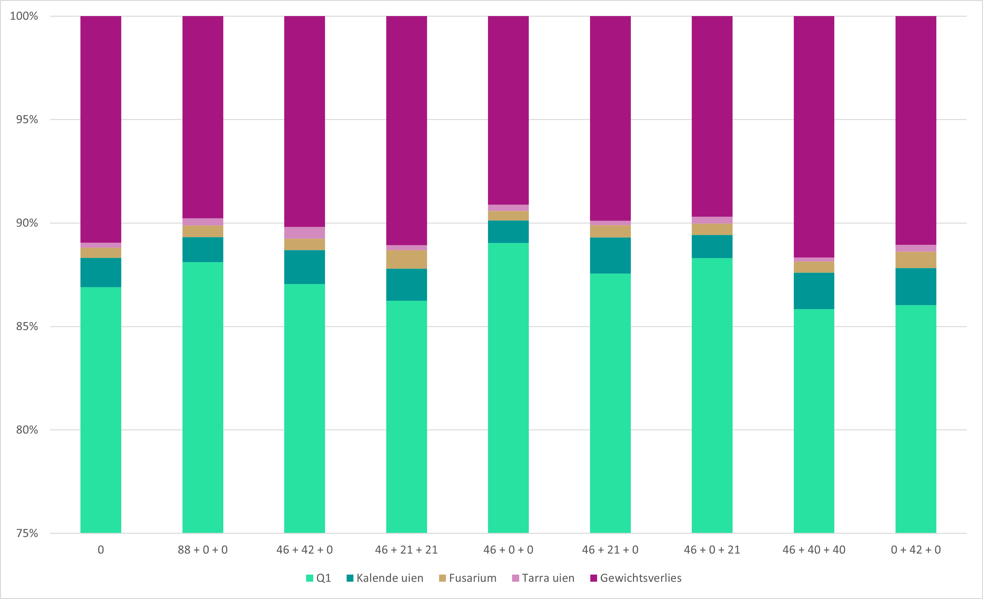 Het percentage kwaliteitsvolle Q1-uien, geschikt voor de versmarkt, varieert van 86 tot 89%. Dit zijn mooie resultaten. Ook hier bleef de invloed van stikstof beperkt. Het aandeel kalende uien schommelt tussen 1 en 2%, ook zonder verschillen door stikstof. Bij een langere bewaring zou het verschil hier vermoedelijk groter zijn geweest.