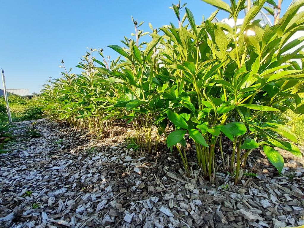 Het gebruik van mulchlagen zorgt ook voor toename van organische stof in de bodem. Op ons proefperceel ging het % koolstof in de bodem op 5 jaar tijd van 1,2% naar 1,6 à 1,8% door gebruik van mulch. Materialen die in de laatste proef met pioenen werden gebruikt zijn stro, bladmulch van populier en wilg en houthaksel al dan niet gecombineerd met groencompost. Het gebruik van houthaksel zorgt voor de beste onkruidonderdrukking, maar nadeel is de hoge C/N-verhouding van het materiaal. Deze waarde is >100 en bij materialen met C/N verhouding hoger dan 30 komt het bodemleven stikstof tekort voor deze afbraak en wordt er stikstof opgenomen uit de omgeving. Deze stikstof is dan tijdelijk niet beschikbaar voor de planten tot het bodemleven opnieuw afsterft. Voor grasmulch, groencompost en bladmulch is de C/N-verhouding kleiner dan 30, voor vertering van deze materialen wordt geen stikstof uit de bodem onttrokken.