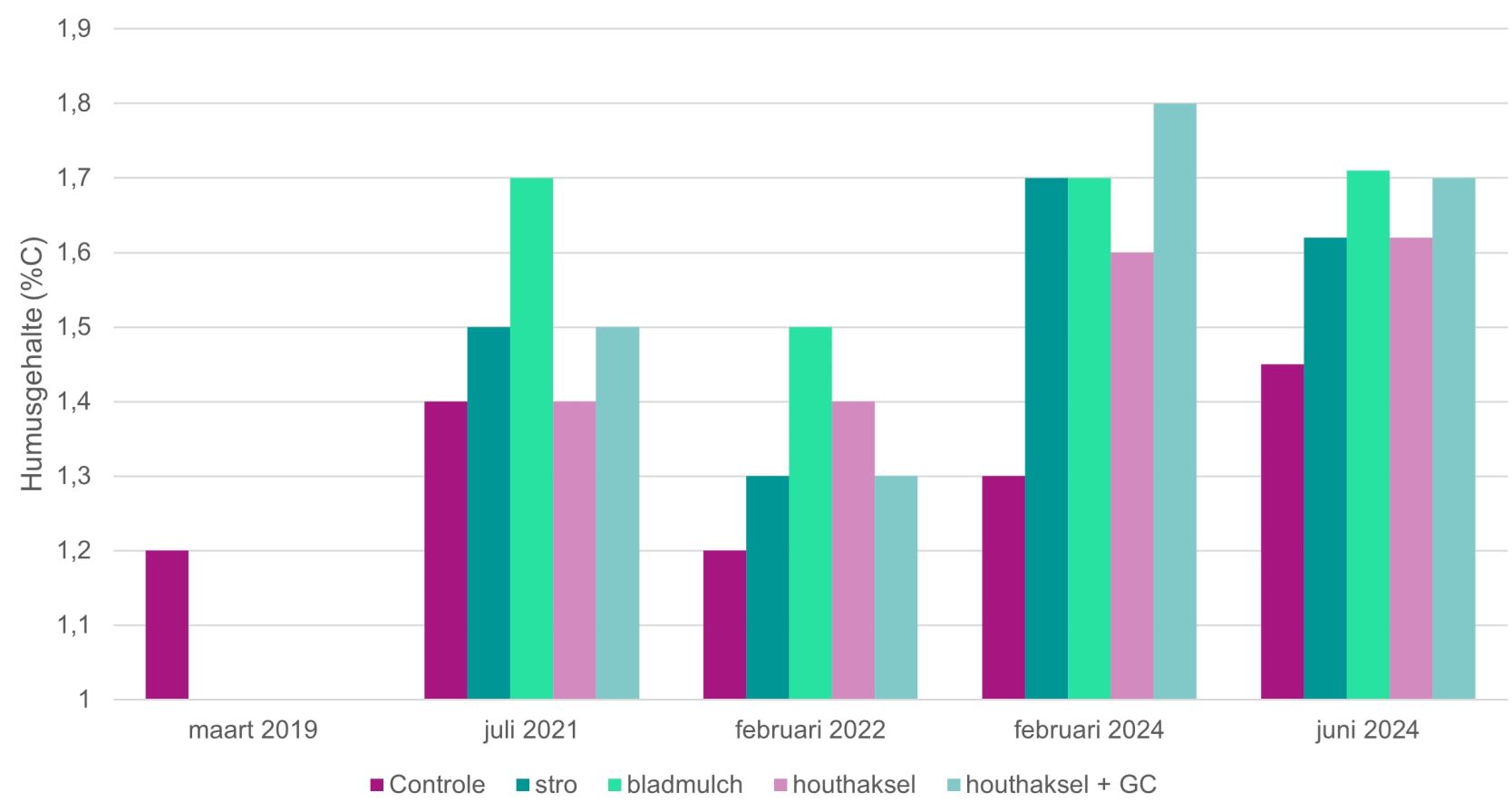 In onze demoproef, waarbij bijbemesting identiek wordt gehouden ongeacht het gebruikte mulchmateriaal, zien we de beste gewasontwikkeling bij gebruik van bladmulch. Het controle object, zonder mulch, bleef als gevolg van enkele opeenvolgende droge zomers, achter in groei. Houthaksel wordt zeker niet aangeraden in één of tweejarige gewassen. Hier kan beter gebruik gemaakt worden van bladmulch, grasmaaisel of een laagje groencompost.