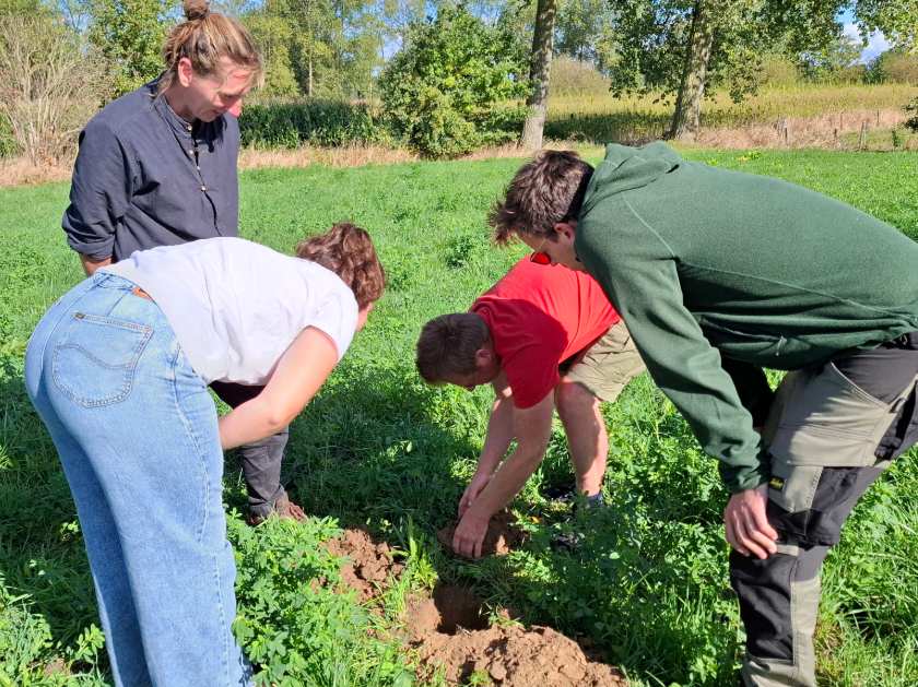 Op de bijeenkomst gingen we met de spade in de grond. Kris werkt al jaren aan een harde laag in de bodem met mengsels van groenbedekkers of grasklavermengsels met diepwortelende soorten, zoals luzerne. Hij maakte de keuze voor groenbedekkers omdat hij ondervond dat op het ene perceel één soort het goed deed, maar een andere niet. Op een ander perceel was het omgekeerde waar. Mogelijks kwam dit door de zuurtegraad van de bodem. Door mengsels te gebruiken zijn er altijd soorten die goed gedijen op die specifieke ondergrond en hij paste zijn mengselkeuze hier ook aan aan. Nu konden we een waardevolle, kruimelige grond zien, maar de harde laag was nog niet helemaal verdwenen.