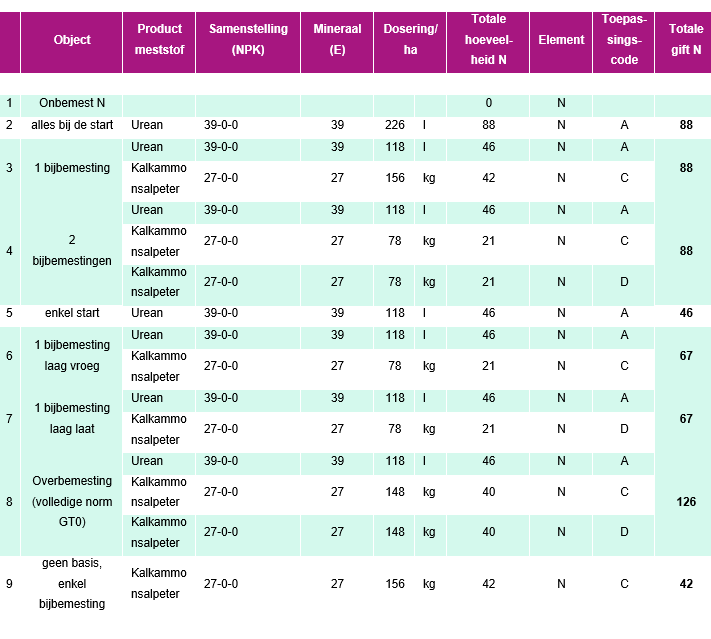 In de proef op Viaverda geldde een norm van 88 E N. Er werden verschillende trappen aangelegd: van nulbemesting (voor N) tot 88 E N. In één object werd de maximale norm van 125 E N aangelegd. De toegepaste trappen vind je in onderstaande tabel.