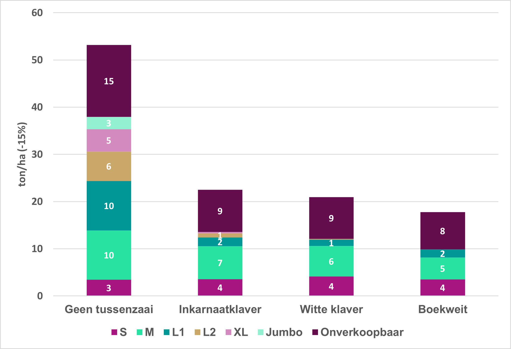 De oogst op 10 oktober 2025 en de sortering op 5 december 2025 tonen dat de groenbedekkers een aanzienlijke daling in opbrengst veroorzaakten in 2025. Veel knollen bleven kleiner door de concurrentie om licht, water en nutriënten met de groenbedekker. Inzaai van inkarnaatklaver leidde tot een opbrengstreductie van 58%. Witte klaver deed het nog iets slechter met een daling van 61%. De sterkste reductie werd gemeten bij boekweit, waar de opbrengst met 67% terugviel.