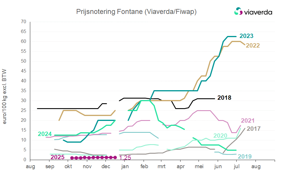 De prijs voor Fontane en Challenger bedraagt i.f.v. afnemer 1 tot 1,5 euro per 100 kg. De marktstemming blijft flauw. Enkele verwerkers zijn actief op de markt. Ze kopen weinig bij of beperken zich tot het afnemen van +50mm aan iets hogere prijs. Er is ook melding van afzet naar zetmeel- en vlokkenindustrie. De export verloopt nog steeds moeilijk door concurrentie.