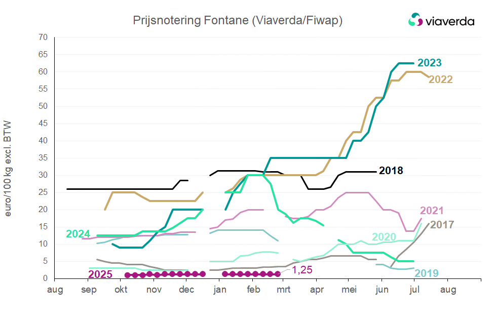 De prijs voor Fontane en Challenger bedraagt i.f.v. afnemer 1 tot 1,5 euro per 100 kg. De marktstemming is flauw. Het aanbod blijft nadrukkelijk aanwezig. Er is geen aankoopinteresse van de verwerking. Door transportproblemen, concurrentie en zeer lage prijzen is er weinig te doen voor export.