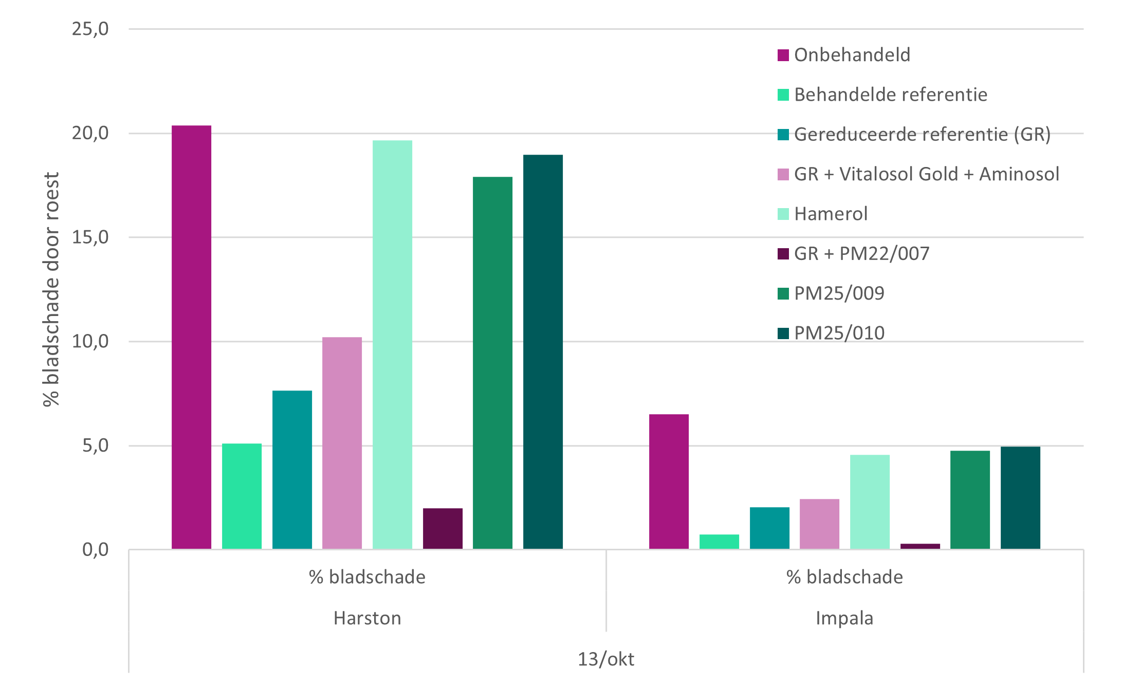 In deze proef werden twee rassen geplant, omdat een duurzame beheersingsstrategie ook een bewuste rassenkeuze omvat. Harston (Nunhems) werd als gevoelig ras gekozen en Impala (Novisem) als toleranter ras. Vanaf eind augustus werden de eerste symptomen van roest in de proef zichtbaar. We zagen de aantasting dan ook de voorbije maanden voortdurend stijgen. Vooral de verschillen tussen de twee rassen werden duidelijk, maar ook enkele behandelingen maakten een groot verschil.