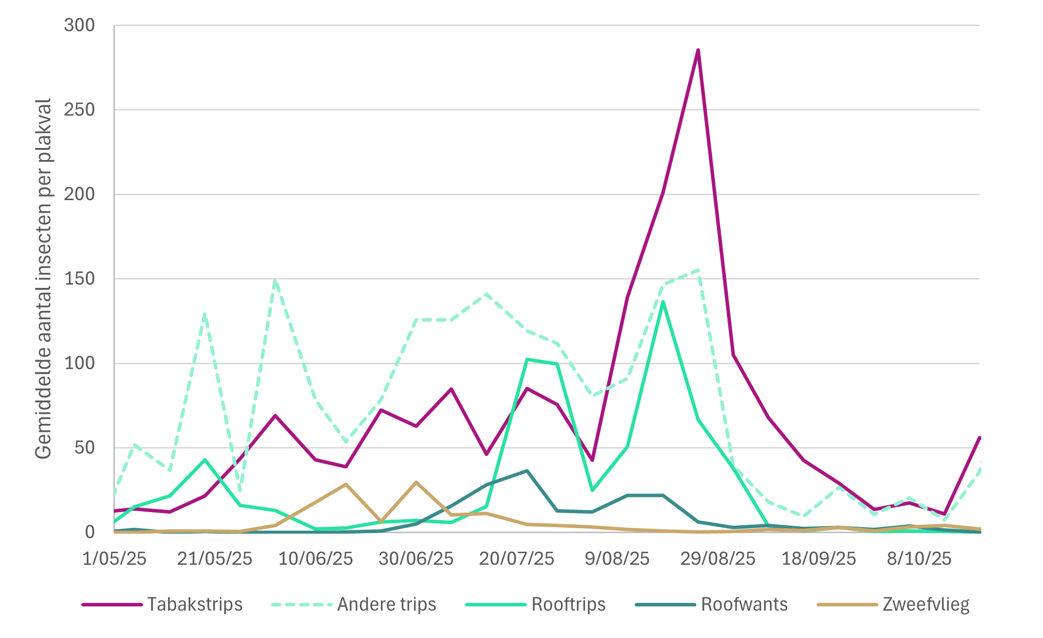 Na de matige zomer van 2024, kende de tripsdruk in 2025 weer een sterke heropleving. Het zachte en droge voorjaar verklaart (waarschijnlijk) de vroegere en sterke opbouw van de activiteit halfweg juni, een tweetal weken vroeger dan 2024 (grafiek bijvoegen). Begin juli vielen er buien, waardoor de druk na de eerste piek wat afnam maar half juli opnieuw toenam. In augustus was het droge en warme weer aanleiding voor een duidelijk piek. Het was ook in die maand dat de schade in verschillende regio’s een vlucht nam. In sommige regio’s, zoals hier in de regio, speelt daarbij ook de migratie van tabakstrips uit de uien mee. De temperaturen waren ook in september nog zacht waardoor de tripsdruk lang kon aanhouden. Nadien zetten de kortere dagen en koelere nachten begin oktober een rem op de ontwikkeling van trips.