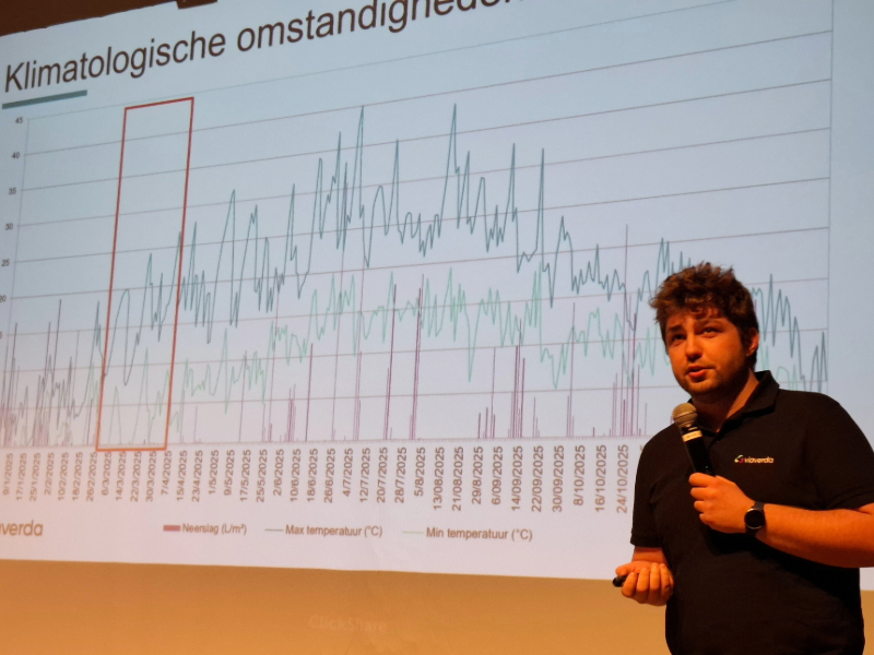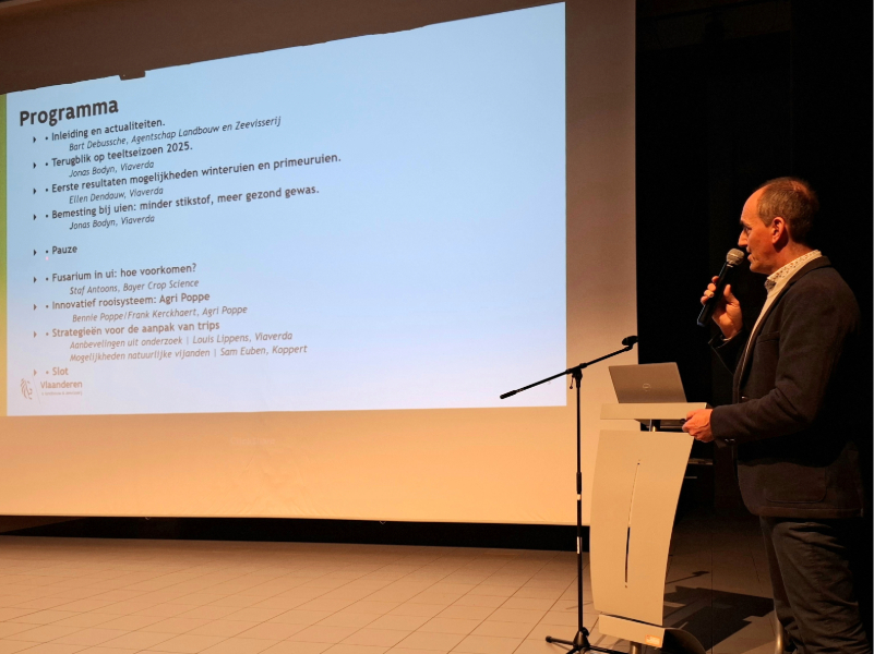 Vervolgens deelde Viaverda-onderzoeker Jonas Bodyn zijn ervaringen uit het teeltseizoen 2025. Het zaaiseizoen startte vroeg en vaak op voldoende vochtige grond. Dat zorgde voor minder risico op dikhalzen en een lagere druk van de uien- en bonenvlieg. Het seizoen werd verder gekenmerkt door warm en droog weer met beperkte neerslag. Het middel Spirotetramat kon in 2025 voor het laatst worden toegepast. Vorig jaar was er bovendien een hoge tripsdruk.