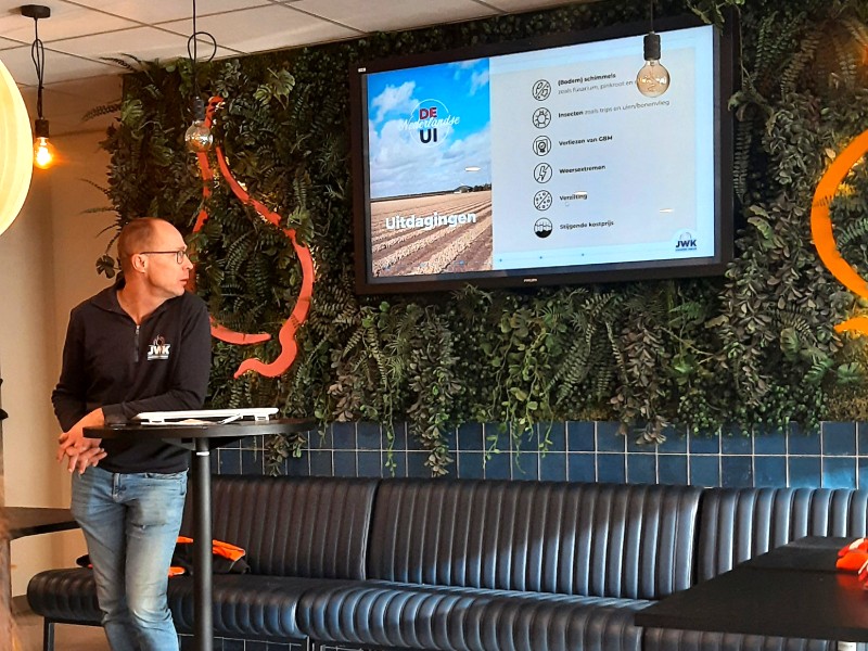 Daarna schetste Werner Verschueren een overzicht van de uitdagingen en kansen in de uienverwerking in Nederland. Naar aanleiding van een vraag van een Vlaamse teler deelde hij ook zijn visie op enkele knelpunten waar de Vlaamse uienteelt nog vaak mee te maken krijgt. Daarbij nam hij vooral de vaak provisorische bewaring op de korrel.