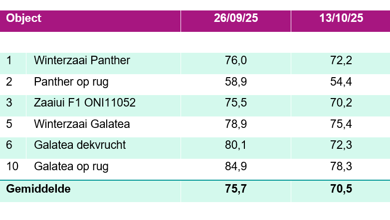 Intussen werden al twee opkomsttellingen uitgevoerd in de winterzaaiui. Op 26 september 2025 stond in de meeste objecten >75% boven. Op 13 oktober 2025 is dit percentage in de meerderheid van de plots gestegen tot boven de 90%. Enkel voor Panther op ruggen is de opkomst duidelijk lager. Het hoogste opkomstpercentage daarentegen, zien we, los van object 4, voor Galatea op ruggen (97,9%). We vermoeden dat object 4, het later gezaaide object, dikker gezaaid werd dan voorzien. Waarschijnlijk als gevolg van foutieve afstelling van de gebruikte handzaaimachine, met een onrealistisch hoog opkomstpercentage als resultaat.