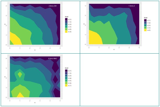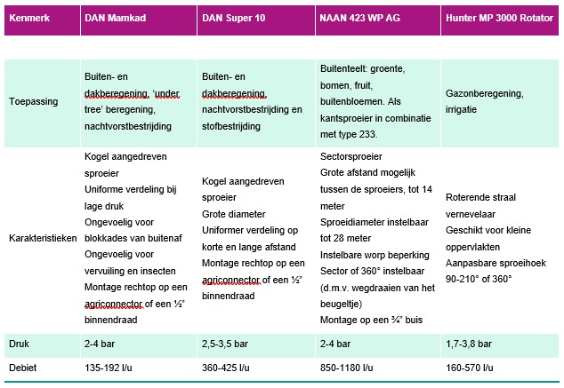De NAAN-dop produceert grovere druppels en kan over een grotere afstand water sproeien. De proefdoppen bij Viaverda waren de kleinst mogelijke met maximale diameter van 8 meter. De resultaten zijn dus enkel geldig voor deze specifieke doppen. Bij windstille omstandigheden wordt een groot volume water afgezet binnen 1,5 meter rond de dop. Echter, bij toenemende wind zien we een compacter sproeibeeld en afname van de effectieve reikwijdte. Hoewel het irrigatiesysteem 8 l/m² vraagt, zien we in de praktijk dat dit slechts bij windstille omstandigheden gehaald wordt, met een gemiddelde van 5 l/m² bij lichte wind.