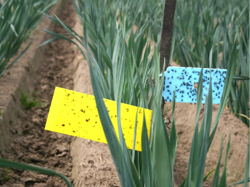 De preimot is een eerder nieuwe plaag in de preiteelt, waar we in kader van een VLAIO LA-traject kennis over hebben opgebouwd naar monitoring en beheersing. Vooral in gebieden en op percelen met hoger risico wordt actief gemonitord. Daarbij maken we enerzijds gebruik van gele vangplaten om adulte vliegen te volgen en anderzijds van bieslookplantjes om hun activiteit na te gaan. Op de bieslookplantjes kunnen we beter opvolgen of ze aanwezig zijn aan de hand van de typische voedingsstippen.