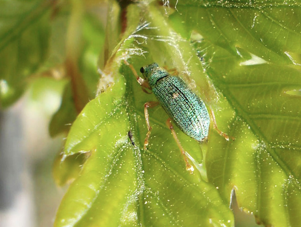 Adulten en eerste bladvraat worden waargenomen op verschillende gewassen. Vooral op loofbomen (o.a. op Tilia, Carpinus, Acer, Fagus, Malus, Prunus, Pyrus, Quercus …) in open lucht, maar ook in binnenomstandigheden is de kever terug te vinden. Bij zonnig weer kan men de kever gemakkelijk terugvinden op de bladeren. Deze snuitkever is voornamelijk te vrezen bij jonge, pas geplante bomen in opkweek en bij het voorkomen van grote aantallen van de kever. Controleer regelmatig de aanwezigheid van deze kever.