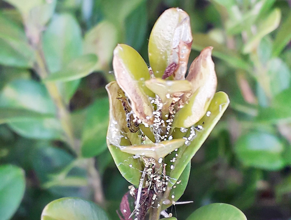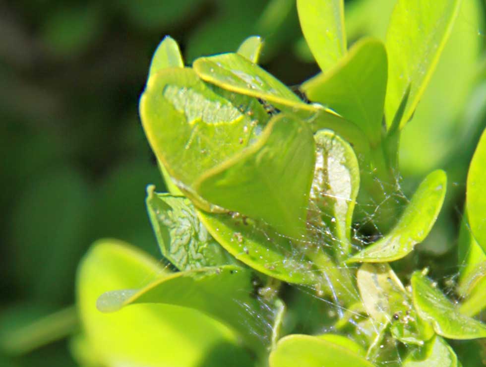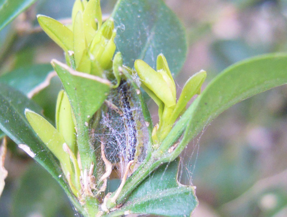 Spinsel, schade en uitwerpselen van de buxusmot. |