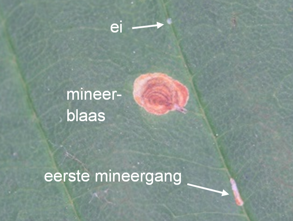 Op dit moment mineren de larven in het blad en zijn de eerste mineergangen en mineerblazen reeds waarneembaar. De adulten vliegen nog steeds uit, maar de piek in de vluchten is bereikt. Schade komt voornamelijk voor bij bomen in aanplant. Ook bij jonge bomen in opkweek kan reeds schade voorkomen.