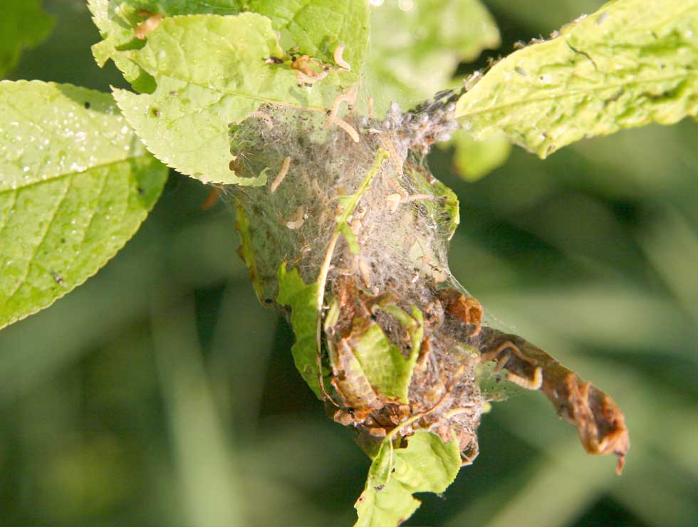 Momenteel zijn de eerste jonge rupsen en eerste spinsels zichtbaar. Aantastingen kunnen zowel in opkweek als in aanplant voorkomen. Vraatschade en hoeveelheid spinsel is iets minder dan andere jaren. Indien nu maar enkele blaadjes ingesponnen zijn, is de aantasting zwak. Planten die kaalgevreten zijn, herstellen zich tegen de zomermaanden, wanneer de vlinders er zijn. Indien nu op de plant veel ingesponnen bladeren en spinsels worden waargenomen, is de aantasting zwaar en kan bij niet ingrijpen volledige kaalvraat voorkomen.